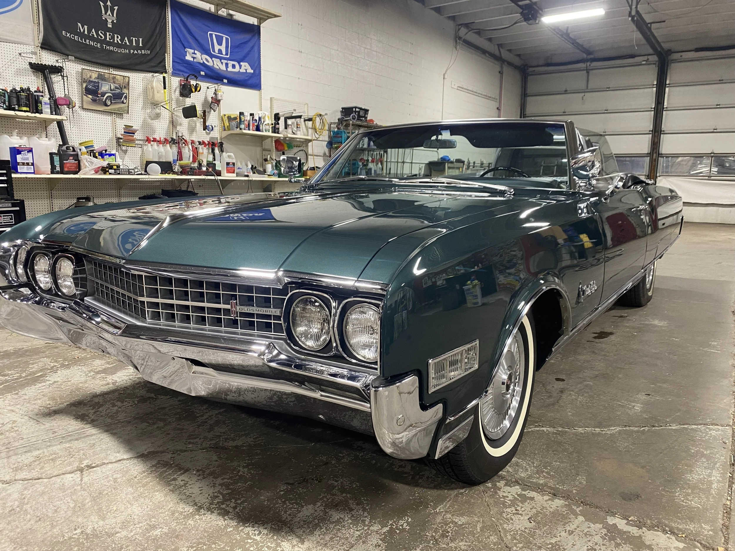 Green vintage Oldsmobile car with chrome accents parked inside a garage with tools and flags on the wall.